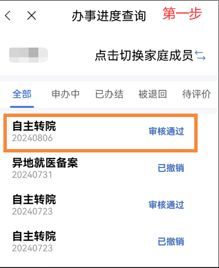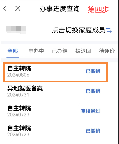 異地就醫(yī)備案成功后,點擊首頁【我要查】-【辦事進度查詢】模塊,在【辦事進度查詢】中選擇已審核通過的需要撤銷的備案信息,點擊【撤