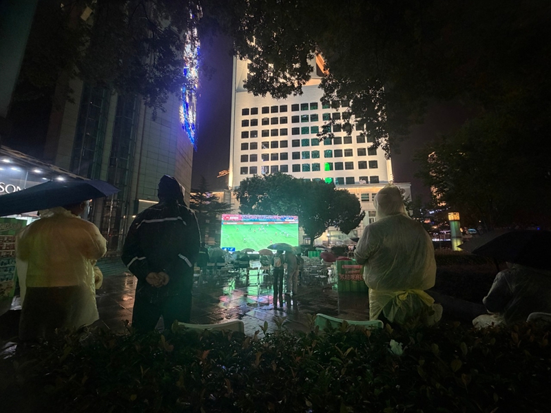 雨中,二泉廣場(chǎng)、三陽百盛等“蘇超”線下觀賽點(diǎn)依舊熱火朝天。露天觀賽區(qū)內(nèi),球迷們或撐傘駐足,或身著雨衣沉浸其中,每一次精彩的傳球都引來陣陣歡呼。人群中,無錫隊(duì)的“鐵桿粉絲”朱新輝格外引人注目:“無錫隊(duì)的比賽,我場(chǎng)場(chǎng)都在‘第二現(xiàn)場(chǎng)’觀賽。和這么多朋友一起吶喊助威,這種氛圍是電視轉(zhuǎn)播無法替代的。”