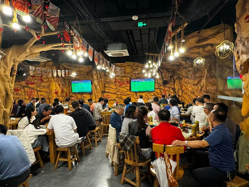 溪南公館大世界影城里也聚起不少觀賽的市民。李先生帶著孩子早早來到影廳中央位置,他們的臉上難掩期待:“我們家都喜歡足球,在電影院里看比賽,不僅有超大銀幕和震撼音效,還可以和球迷們交流,舒適度和氛圍感都很好。”觀賽活動(dòng)不僅讓市民過足癮,也為商家?guī)砹藢?shí)實(shí)在在的流量“紅利”。那天以后·重慶燒烤海鮮溪南公館店內(nèi)座無虛席,客人們吃烤串、喝啤酒、看球賽,一起為無錫隊(duì)干杯,喝彩聲和歡笑聲此起彼伏。“客流量、酒水銷售額均比沒有賽事的普通周日增長(zhǎng)了50%。”店長(zhǎng)徐培生認(rèn)為,“蘇超”這股熱勁把人氣實(shí)實(shí)在在帶到了線下。為讓廣大球迷更直觀感受“第二現(xiàn)場(chǎng)”氛圍,門店在大廳里裝了3塊直播大屏,在每個(gè)包廂里也都安排了電視直播,確保每個(gè)位置都能享受比賽。