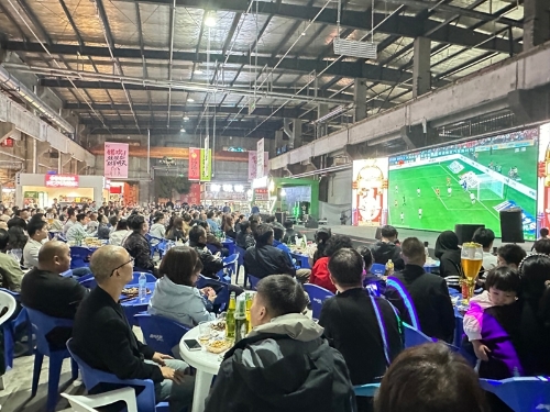在1969創(chuàng)意工場(chǎng)南方夜市,空氣里彌漫著油炸的焦香和沸騰的人聲,夜市中央的巨型大屏前座無虛席。賣舟山鐵板魷魚的潘先生忙得頭也不抬:“球迷們一邊吃一邊看,時(shí)不時(shí)還要點(diǎn)單,今天的生意比平時(shí)好了不少。”對(duì)面手打檸檬茶的攤位上同樣火爆,光檸檬就消耗了50斤,補(bǔ)了三四次茶葉,平時(shí)一晚上賣出三四桶,當(dāng)天賽事剛開始,第六桶便已見底。南方夜市商家們?cè)诒WC食品安全的基礎(chǔ)上全力增加了備貨量,保障球迷吃喝一應(yīng)俱全。球迷顏亞鵬和3位朋友圍坐一起,桌上擺滿啤酒和烤串、炸薯?xiàng)l等各色小吃。“我們傍晚6點(diǎn)多就來占位子了,這種比賽,就得在夜市看,最有氛圍。”