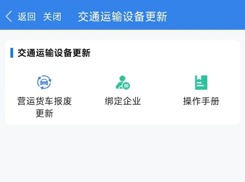 2.實(shí)名認(rèn)證后點(diǎn)擊“交通運(yùn)輸設(shè)備更新”,先選擇綁定企業(yè),再進(jìn)行申報(bào)。