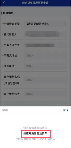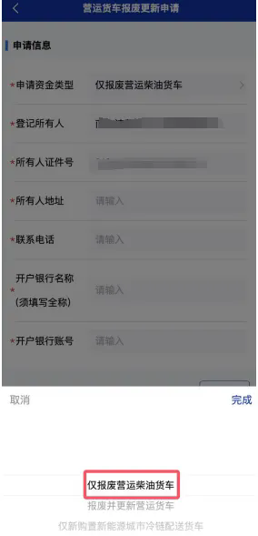 2.請(qǐng)根據(jù)自身情況選擇“僅報(bào)廢老舊營(yíng)運(yùn)貨車、報(bào)廢并更新?tīng)I(yíng)運(yùn)貨車、僅新購(gòu)新能源城市冷鏈配送貨車”三種類型之一進(jìn)行申報(bào),提交后不得更改。 3.非營(yíng)運(yùn)車輛和輕型貨車(除新能源城市冷鏈配送貨車外)不在本次補(bǔ)貼之列。
