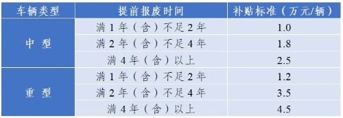 1.報(bào)廢車輛每輛補(bǔ)貼1萬(wàn)-4.5萬(wàn)(詳見(jiàn)表1),新購(gòu)車輛每輛補(bǔ)貼2.5萬(wàn)-9.5萬(wàn)(詳見(jiàn)表2)。