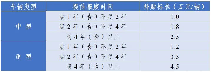 今年老舊營(yíng)運(yùn)貨車報(bào)廢更新的補(bǔ)貼標(biāo)準(zhǔn)與去年基本保持一致,按照?qǐng)?bào)廢車輛類型、提前報(bào)廢時(shí)間和新購(gòu)置車輛動(dòng)力類型等,實(shí)施差別化補(bǔ)貼,具體如下: