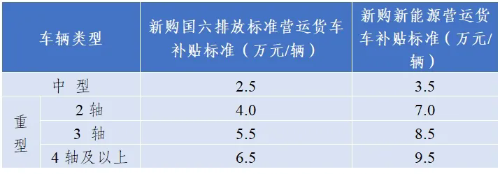 3.對(duì)距離強(qiáng)制報(bào)廢年限不滿一年的國(guó)四及以下排放標(biāo)準(zhǔn)營(yíng)運(yùn)貨車實(shí)施報(bào)廢,并新購(gòu)中重型國(guó)六排放標(biāo)準(zhǔn)貨車或新能源貨車的,按照新購(gòu)補(bǔ)貼標(biāo)準(zhǔn)予以補(bǔ)貼;對(duì)掛車不予補(bǔ)貼。