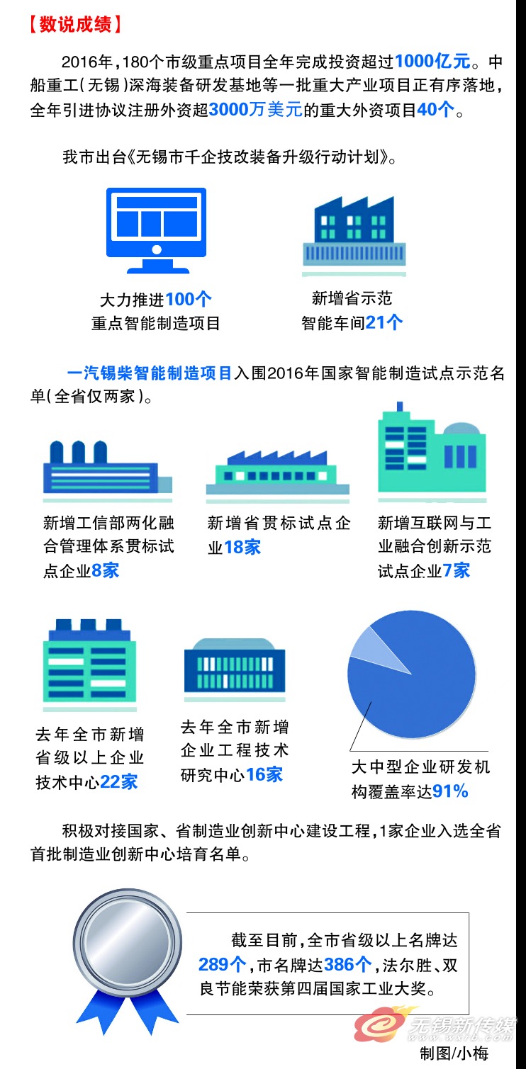 剛剛過去的2016,是無錫市委、市政府確立“產(chǎn)業(yè)強(qiáng)市”發(fā)展戰(zhàn)略的第一個(gè)完整年。在這一年中,全市上下緊緊圍繞全力打造無錫現(xiàn)代產(chǎn)業(yè)發(fā)展新高地這一目標(biāo),聚焦重點(diǎn)、強(qiáng)化責(zé)任,狠抓措施落實(shí),著力推進(jìn)產(chǎn)業(yè)智能化、綠色化、服務(wù)化、高端化發(fā)展,全市現(xiàn)代產(chǎn)業(yè)發(fā)展工作交出了一張令人欣喜的“周年成績(jī)單”。數(shù)據(jù)顯示,2016年全市規(guī)模工業(yè)實(shí)現(xiàn)產(chǎn)值同比增長(zhǎng)3%左右,增加值同比增長(zhǎng)5.7%左右,工業(yè)投資同比增長(zhǎng)10%左右,產(chǎn)業(yè)發(fā)展的質(zhì)量效率不斷提高、發(fā)展效率進(jìn)一步增強(qiáng)。