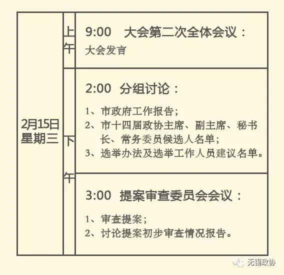 各代表團(tuán)分組審議(時(shí)間:9:00) 審議政府工作報(bào)告、“計(jì)劃”、“預(yù)算”報(bào)告及相關(guān)決議(草案); 審議《無(wú)錫市制定地方性法規(guī)條例(修訂草案)》; 醞釀、討論國(guó)家機(jī)關(guān)領(lǐng)導(dǎo)人候選人初步名單; 推選選舉工作人員; 聯(lián)合提名有關(guān)候選人。