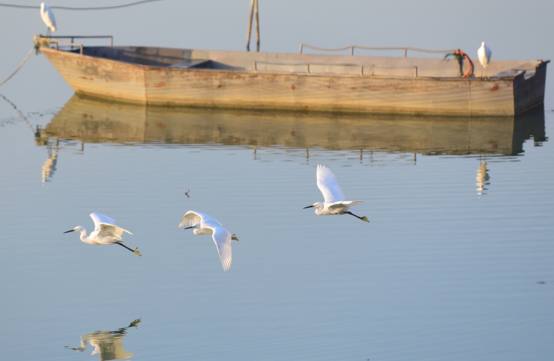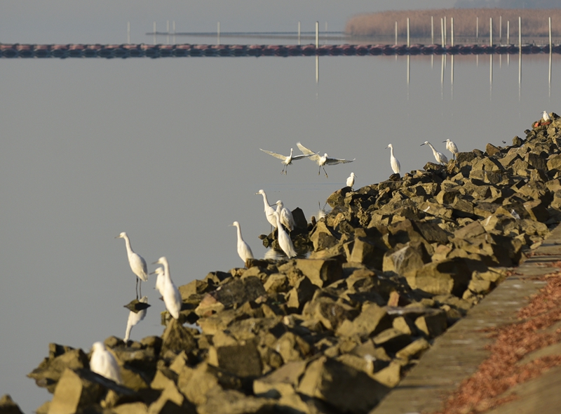 1月14日,鷺鳥在太湖新城太湖飛舞嬉戲。 寒冬時節(jié),成群鷺鳥棲息在無錫太湖邊,成為一道靚麗的風景。