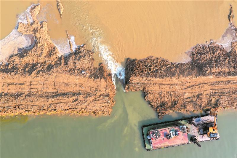 昨天上午8點,太湖隧道南泉段施工現(xiàn)場一片繁忙。隨著挖機揮動鐵臂挖開圍堰,隧道南側(cè)出現(xiàn)了一處入水口,汩汩湖水從太湖流入圍堰內(nèi)。中鐵四局太湖隧道項目部工程部部長何杰紅介紹,本次回水為隧道第7倉至第10倉,回水量約90萬立方米,預計回水時長約48小時。此次回水后將新增1.5公里的隧道主體處于水面以下,隧道整體“潛入”湖底。