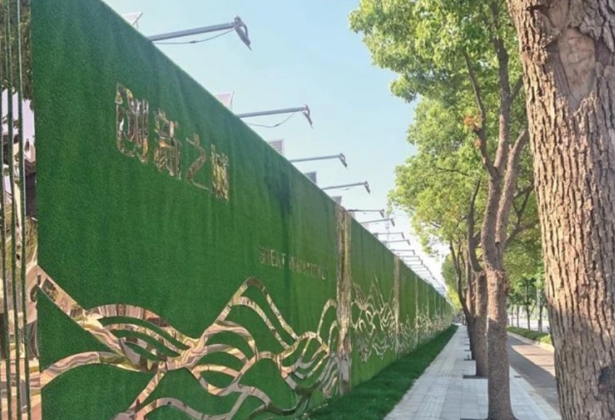 5米高的綠植圍擋上,以寫意風(fēng)格裝飾了地鐵列車元素和心跳元素,圍擋頂端外側(cè)布設(shè)照明燈探出半空,內(nèi)側(cè)則安裝一排降塵、除霾、增氧噴淋。這個(gè)猶如街心花園的地方,其實(shí)是位于貢湖大道和隱秀路口的無(wú)錫醫(yī)療健康產(chǎn)業(yè)園項(xiàng)目工地。