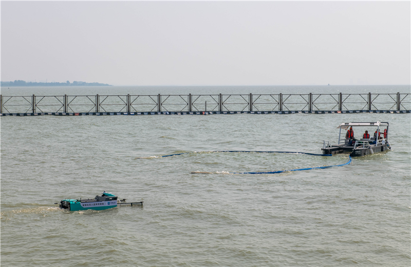 26日,記者來到南泉水源廠,走上棧橋,只見岸邊近10臺推流器開足馬力卷起浪花,防止藻類沿岸聚集。遠(yuǎn)眺湖心取水口,多臺水上“神器”正在湖面忙碌著。智慧打撈船兩只長臂好似龍蝦觸角,長臂頂端裝有微型牽引機(jī)器人控制開合,行船時可一邊抽吸湖水一邊過濾水中的藻類顆粒,相比人工拉網(wǎng)清藻效率提升數(shù)倍。無人監(jiān)測預(yù)警船如同水上的“掃地機(jī)器人”,預(yù)設(shè)好路線就可自動巡航監(jiān)測水質(zhì),24小時待命,電量不足時自動返回充電。