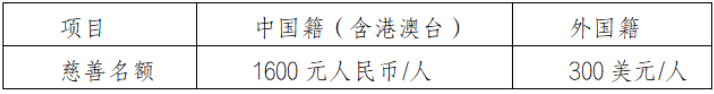 本次賽事馬拉松項(xiàng)目開(kāi)放300個(gè)慈善名額,半程馬拉松項(xiàng)目開(kāi)放200個(gè)慈善名額,報(bào)滿截止,選報(bào)慈善名額的運(yùn)動(dòng)員可直接獲得參賽資格。慈善名額2月17日開(kāi)放報(bào)名通道,名額額滿即止,報(bào)名一經(jīng)確認(rèn),不接受退款申請(qǐng)。慈善名額報(bào)名費(fèi)如下: