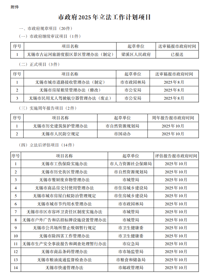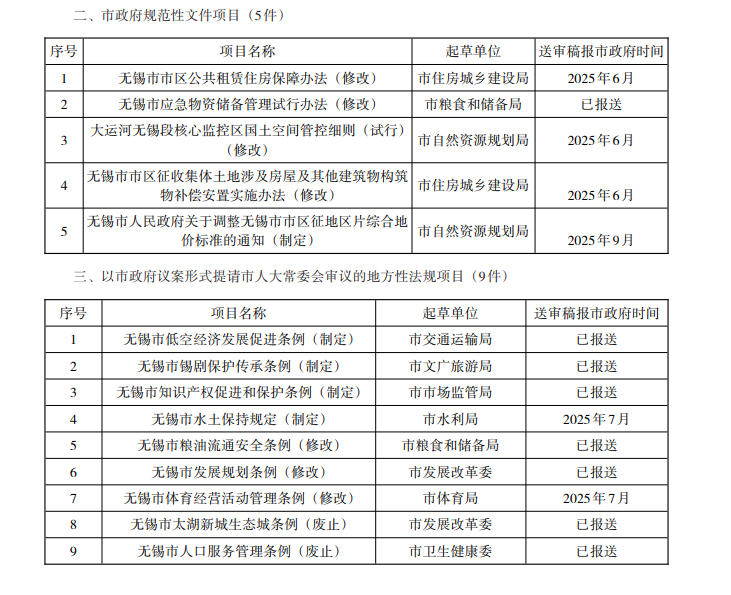無錫市人民政府 2025 年立法工作計(jì)劃