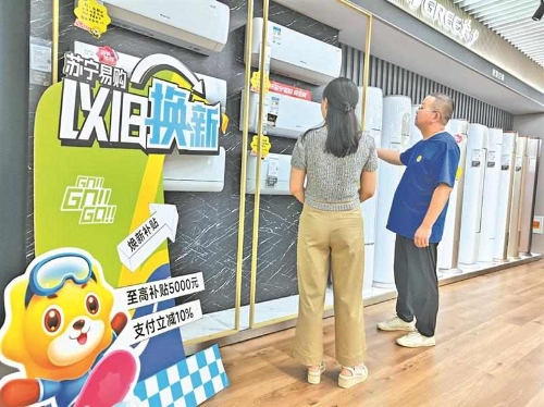 政策環(huán)境趨穩(wěn),無疑給消費者和商家都吃下了一顆“定心丸”,為消費市場注入持久活力。“國補”東風下,無錫蘇寧易購主動出擊,打造“818大促”活動,聯(lián)合頭部品牌,策劃家電秒殺、以舊換新補貼加碼等多重優(yōu)惠,與“國補”政策形成強力共振。“消費者‘買買買’的熱情顯著提升。”蘇寧易購無錫大區(qū)門店運營總經理王曉玲介紹,平臺數(shù)據(jù)顯示,近期中央空調銷售同比暴增621%,清潔電器增長54%。